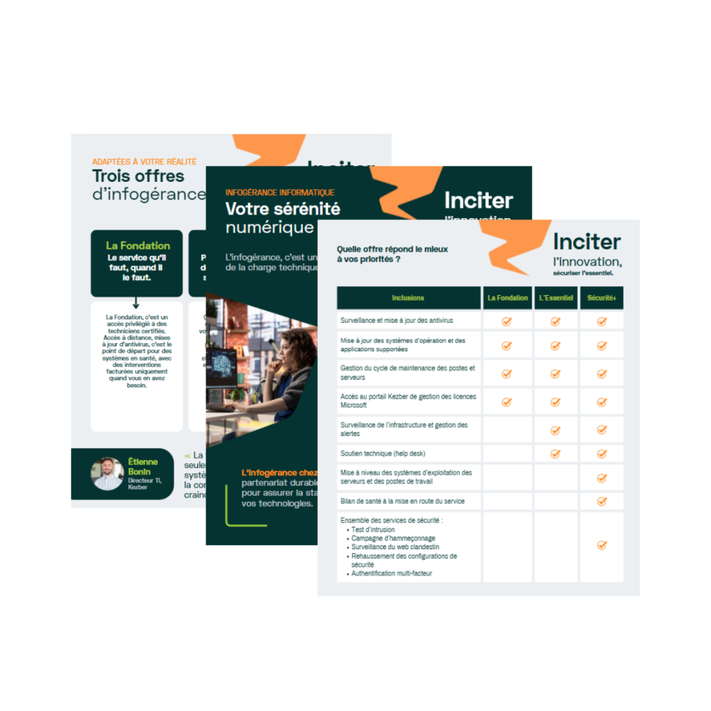 Nous avons développé trois offres d’infogérance pour répondre aux besoins de toutes les entreprises, de la plus petite à la plus grande. Parce que la sécurité et la gestion efficace des TI ne sont pas réservées aux grandes organisations. Peu importe votre taille ou votre secteur, vous méritez des systèmes stables, protégés et performants, soutenus par une équipe d’experts d’ici.